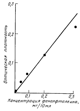 V.5.1. Приготовление стандартных растворов фенолфталеина и построение калибровочной кривой 0,5 г фенолфталеина растворяют в 100 мл этанола, получают раствор 0,5 %-ной концентрации. Из стандартного раствора берут аликвоты, содержащие 0,1; 0,2; 0,5; 1,0; 2,0; 5,0 мг фенолфталеина, и переносят в мерные колбы емкостью 50 мл, доливают этанолом до метки. Получают таким образом серию рабочих растворов, 1 мл которых содержит 0,002; 0,004; 0,01; 0,02; 0,04; 0,1 мг фенолфталеина, 5 мл рабочего раствора переносят в пробирку и добавляют 5 мл 10 %-ного раствора аммиака. Окрашенные растворы колориметрируют на ФЭК с синим светофильтром. Окраска устойчива в течение 1 ч. Результаты измерения оптической плотности окрашенных растворов фенолфталеина различных концентраций представлены в табл. V.5.2, калибровочная кривая для кюветы толщиной 20 мм - на рис. V.5.1. Линейная зависимость оптической плотности от концентрации растворов фенолфталеина наблюдается в интервале от 0,01 до 0,5 мг/10 мл. Рис. V.5.1. Калибровочная кривая для определения концентрации фенолфталеина Таблица V.5.2 Результаты измерения оптической плотности рабочих растворов фенолфталеина