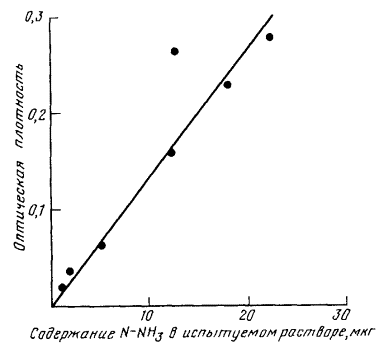 где X - количество аммиачного азота, мг N-NH3/100 г; С - концентрация N-NH3, найденная по калибровочной кривой, мг/мл; V1 - общий объем вытяжки, мл; V2 - объем аликвотной части, мл; a - навеска почвы, г; 1000 - коэффициент для перевода мкг в мг; К - коэффициент пересчета веса почвы на вес высушенной при 100-105 °С почвы; 100 - коэффициент пересчета на 100 г почвы. VI.3.1. Приготовление стандартных растворов сернокислого аммония и построение калибровочной кривой 0,4717 г (NH4)2SO4, высушенного до постоянного веса, помещают в мерную колбу емкостью 1000 мл, растворяют в дистиллированной воде и объем раствора доводят до метки. Концентрация исходного раствора равна 100 мкг N/мл. Для приготовления стандартных растворов в мерные колбочки емкостью 100 мл отбирают 1, 2, 5, 8, 12, 15, 18, 22, 25, 28 мл исходного раствора и доливают дистиллированной водой до метки. 1 мл каждого стандартного раствора содержит соответственно 1, 2, 5, 8, 12, 15, 18, 22 мкг N-NH3. 1 мл раствора помещают в мерную колбу емкостью 50 мл, доводят объем дистиллированной водой примерно до 10 мл, затем приливают 4 мл раствора фенолята натрия и сразу же 3 мл раствора гипохлорита натрия. После добавления каждого реактива смесь тщательно перемешивают. Через 20 мин объем смеси доводят до метки и интенсивность окраски просматривают на ФЭК с красным светофильтром, используя кювету объемом 20 мл или на спектрофотометре при длине волны 620 нм. Окраска индофенола голубого устойчива в течение 1 ч. Результаты измерений оптической плотности представлены в табл. VI.3.1, а калибровочная кривая - на рис. V.6.1. Линейная зависимость оптической плотности от концентрации N-NH3 для кюветы толщиной 20 мм сохраняется в интервале концентраций от 1 до 22 мкг /50 мл. Таблица VI.3.1 Результаты измерений оптической плотности растворов (NH4)2SO4 на приборе ФЭК-М