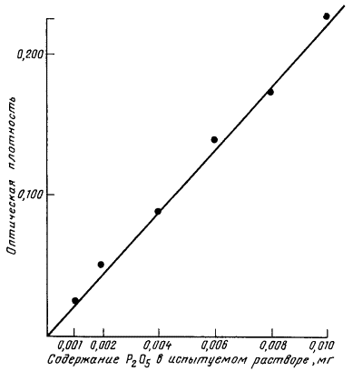 где Х - количество подвижного фосфора на 100 г воздушно-сухой почвы, мг Р2O5/100 г; С - концентрация Р2О5, найденная по калибровочной кривой, мг/кг; V1 - общий объем вытяжки, мл; V2 - объем аликвотной части, мл; а - навеска воздушно-сухой почвы, г; 100 - коэффициент пересчета на 100 г воздушно-сухой почвы; К - коэффициент пересчета на почву, высушенную при 100-105 °С. VI.2.1. Приготовление стандартных растворов фосфата и построение калибровочной кривой 0,1917 г КН2РО4 х.ч. растворяют в дистиллированной воде в мерной колбе емкостью 1 л, доливают водой до метки, перемешивают, хранят в склянке из темного отекла. 1 мл полученного образцового раствора содержит 0,1 мг P2O5. Затем готовят серию рабочих растворов (в 3-4 повторностях), содержащих в 1 мл 0,001; 0,002; 0,004; 0,006; 0,008; 0,01 мг. Для этого из образцового раствора берут аликвоты соответственно 0,5; 1; 2; 3; 4; 5 мл, содержащие 0,5; 0,1; 0,2; 0,3; 0,4; 0,5 мг и переносят в мерные колбочки на 50 мл, объем которых затем доводят дистиллированной водой до метки. Затем их взбалтывают. Из каждой колбочки берут аликвоту 1 мл и переносят в пробирку (на 10-15 мл). Приливают 2 мл кислого раствора молибденово-кислого аммония (концентрация его в испытуемом растворе должна быть 0,001 мг/мл), затем 7 мл дистиллированной воды, перемешивают и капают 1 каплю восстановителя (2,5 % раствор SnCl2), немедленно перемешивают. Окрашенные в синий цвет растворы колориметрируют на ФЭКе (длина волны 650 нм или используют красный светофильтр). Отроят график зависимости оптической плотности растворов от концентрации Р2О5 в стандартных растворах (табл. VI.2.1, рис. VI.2.1). Рис. VI.2.1. Калибровочный график для определения концентрации Р2О5 Таблица VI.2.1 Результаты измерений оптической плотности стандартных растворов