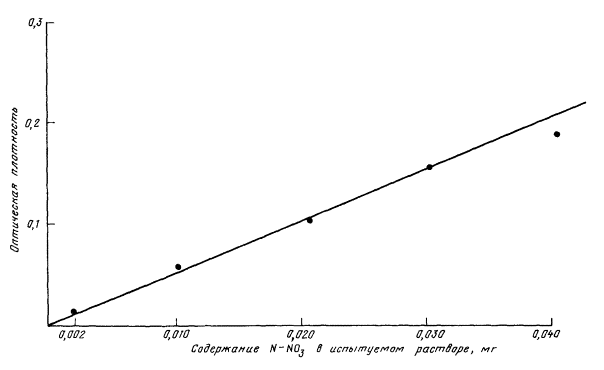 где X - количество нитратного азота, мкг N-NO3/100 г; С - концентрация N-NO3, найденная по калибровочной кривой; V1 - общий объем вытяжки (50 мл), V2 - объем аликвотной части, a - навеска почвы (5 г), К - коэффициент пересчета веса почвы на вес высушенной при температуре 100-150°С почвы. Присутствие в вытяжке значительных количеств аммонийных солей снижает результаты определения. Для предотвращения отрицательного влияния солей перед выпариванием вытяжки в фарфоровую чашку добавляют 2-3 капли 10 %-ного раствора сернокислого калия. Присутствие в вытяжках Сl- также мешает определению. При содержании Cl более 30 мг в 1 л к 100 мл вытяжки прибавляют 0,1 г AgSO4, смесь взбалтывают 25 мин. Для осаждения избытка Аg+ в раствор добавляют в виде сухих реактивов 0,2 г Са(ОН)2 и 0,5 г MgCO3, взбалтывают 5 мин и фильтруют через складчатый фильтр. Далее выпаривают аликвоту, как указывалось выше. При удалении хлора серебром подщелачивание раствора проводят не NaOH или КОН, а аммиаком. VI.4.1. Приготовление стандартных растворов нитрата калия и построение калибровочной кривой Основной раствор 0,722 г KNO3, перекристаллизованного и высушенного при 100-105°С до постоянного веса, отвешивают на аналитических весах, переносят в мерную колбу на 1 л, растворяют в дистиллированной воде, объем раствора доводят водой до метки, хорошо перемешивают. 1 мл раствора содержит 0,01 мг N-NO3. Рабочий раствор. Готовят разведением основного раствора в 50 раз водой. Рабочий раствор содержит 0,002 мг N-NO3 в 1 мл. Его используют для приготовления образцовых стандартных растворов. Для этого 1, 5, 10, 15, 20 мл рабочего раствора выпаривают в фарфоровых чашках. После выпаривания чашки с сухим остатком охлаждают и по каплям добавляют в них 1 мл дисульфофеноловой кислоты, стараясь смочить находящийся на дне и стенках чашки остаток. Сухой остаток тщательно растирают с дисульфофеноловой кислотой стеклянным пестиком или стеклянной палочкой с оплавленным концом и оставляют на 10 мин. Затем в каждую чашку приливают по 15 мл дистиллированной воды, смачивая всю поверхность чашек, чтобы собрать все продукты нитрования. Затем 20 %-ным раствором KOH или NaOH нейтрализуют кислый раствор и доводят до щелочной реакции и добавляют избыток щелочи (1 каплю). Окрашенные в желтый цвет растворы переносят в мерные колбы на 50 мл, при этом чашку и стеклянную палочку несколько раз ополаскивают водой, которую присоединяют к раствору в мерной колбе. Объем растворов доводят водой до метки. Растворы перемешивают. Оптическую плотность растворов определяют тотчас же после развития окраски. Интенсивность окраски при стоянии испытуемых растворов снижается. Измерения проводят на приборах фотоэлектроколориметра, пользуясь синим сфетофильтром, или спектрофотометре (l=440 нм). Пример результатов измерений оптической плотности растворов на приборе ФЭК-М представлен в табл. VI.4.1, а кривая зависимости оптической плотности растворов от концентрации нитрат-иона на рис. VI.4.1. Таблица VI.4.1 Результаты измерений оптической плотности растворов КNО3 на приборе ФЭК-М