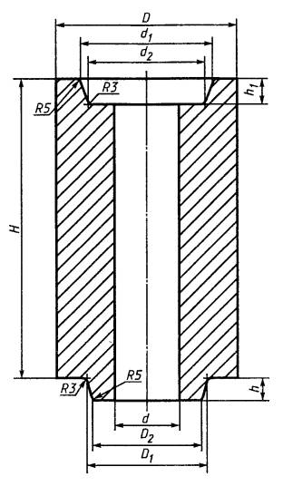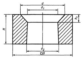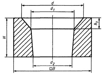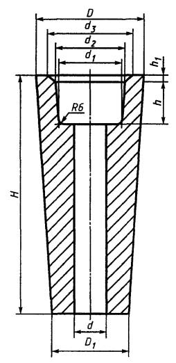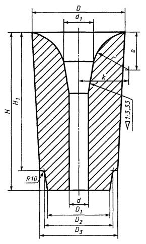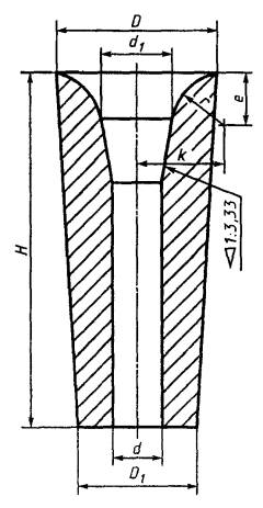 7.1.4 При проверке готовой продукции измеряют следующие размеры изделий: стопорная трубка - Н, h, h1, D, d (рисунок 1, таблица 2); пробка - Н, h, D, d1 (рисунок 2, таблица 3); стакан - Н, h, h1, D, D1, d, d1 (d1 - для стакана номеров 25 - 30, 33, 34) (рисунки 3 - 7, таблицы 4 - 8); вкладыш - h, d, d1, d2 (рисунок 8, таблица 9); гнездовой кирпич - В, Н, H1, h1, d, d1, d2, d3 (рисунки 9 - 12, таблицы 10 - 12). Точность остальных размеров и конусность изделий обеспечиваются пресс-оснасткой и контролю не подлежат. 8 Методы контроля8.1 Химический состав определяют по ГОСТ 2642.0, ГОСТ 2642.2 - ГОСТ 2642.5 и ГОСТ 2642.8 или другими методами, обеспечивающими требуемую точность определения. 8.2 Огнеупорность определяют по ГОСТ 4069. 8.3 Открытую пористость и кажущуюся плотность определяют по ГОСТ 2409 или ГОСТ 25714, вкладыша и гнездового кирпича - по ГОСТ 2409. Определения по ГОСТ 25714 проводят на удвоенном количестве образцов. Контрольный метод - по ГОСТ 2409. 8.4 Предел прочности при сжатии определяют по ГОСТ 4071.1 или ГОСТ 25714, гнездового кирпича - по ГОСТ 4071.1. Предел прочности при сжатии по ГОСТ 25714 определяют на удвоенном количестве образцов. Контрольный метод - по ГОСТ 4071.1. 8.5 Массовую долю влаги определяют по ГОСТ 28584 на образцах массой 50 - 100 г. 8.6 Температуру начала размягчения определяют по ГОСТ 4070. 8.7 Дополнительную линейную усадку определяют по ГОСТ 5402.1. 8.8 Метод определения термической стойкости приведен в приложении В. 8.9 Размеры и овальность измеряют металлической линейкой по ГОСТ 427, штангенциркулем по ГОСТ 166 или рулеткой по ГОСТ 7502. Овальность определяют как разность наибольшего и наименьшего диаметров одного сечения изделия. 8.10 Глубину отбитости углов и ребер измеряют по ГОСТ 15136. 8.11 Кривизну определяют на поверочной плите по ГОСТ 10905 или аттестованной металлической плите при помощи щупа [1] или щупа-шаблона шириной 10 мм и толщиной, превышающей на 0,1 мм установленную норму кривизны. Щуп (щуп-шаблон) не должен входить в зазор между плитой и изделием. При определении кривизны изделие слегка прижимают к плите и щуп (щуп-шаблон) вводят в зазор скольжением по плите без применения усилия. 8.12 Для определения скошенности торцовых плоскостей стопорной трубки поверочный угольник типа VII или VIII по ГОСТ 3749 длиной измерительной стороны не менее 250 мм плотно прикладывают одной стороной к образующей стопорной трубки, а второй - к торцу изделия. В образующийся зазор вводят щуп [1] или щуп-шаблон. Скошенность определяют по максимальному зазору, образующемуся между стороной угольника и торцовой плоскостью. Для стопорной трубки с конусностью скошенность определяют по указанному максимальному зазору, уменьшенному на значение, равное произведению диаметра измеряемого торца трубки на конусность изделия. 8.13 Диаметр выплавки измеряют в месте ее максимальной величины металлической линейкой по ГОСТ 427. 8.14 Длину посечки или трещины измеряют металлической линейкой по ГОСТ 427. Ширину посечки или трещины измеряют в месте ее максимального размера измерительной лупой по ГОСТ 25706. Лупу располагают таким образом, чтобы ее шкала была перпендикулярна посечке или трещине. Между шкалой измерения и поверхностью изделия помещают полоску бумаги, которую располагают вдоль шкалы вплотную к делениям. 8.15 Диаметр выплавки на рабочей поверхности стакана и винтовой нарезке пробки, длину посечки на нерабочей поверхности стопорной трубки и нижней части выемки стакана по