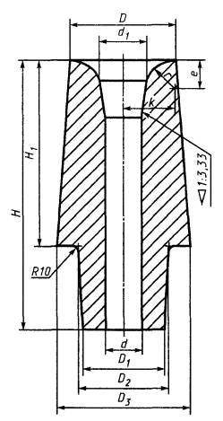 По соглашению сторон допускается изготавливать изделия других форм и размеров по чертежам заказчика с указанием предельных отклонений по размерам. 5.1.1 Допускается радиус закругления вертикальных граней в наружных углах гнездового кирпича до 8 мм. На конусной части внутренней поверхности гнездового кирпича (по d2 - для номеров 37 - 45; по d3 - для номера 46; по d1 и d2 - для номера 49) допускается цилиндрический поясок высотой 5 - 10 мм. 5.1.2 Расчетный объем, расчетная масса и средняя кажущаяся плотность стопорных изделий (приложение А) не являются браковочным признаком. 5.1.3 Форма и размеры винтовой нарезки металлического стопорного штыря приведены в приложении Б. 5.2 Предельные отклонения размеров изделий должны соответствовать указанным в таблице 13. Таблица 13 - Предельные отклонения размеров