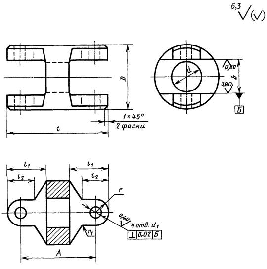 3 Постановлением Государственного комитета Российской Федерации по стандартизации и метрологии от 2 марта 2001 г. № 113-ст межгосударственный стандарт ГОСТ 5147-97 введен в действие непосредственно в качестве государственного стандарта Российской Федерации с 1 января 2002 г. 4 ВЗАМЕН ГОСТ 5147-80 ГОСТ 5147-97 МЕЖГОСУДАРСТВЕННЫЙ СТАНДАРТ МУФТЫ ШАРНИРНЫЕ Параметры, конструкция и размеры Joint couplings. Дата введения 2002-01-01 1 Область примененияНастоящий стандарт распространяется на малогабаритные шарнирные муфты общемашиностроительного применения, климатических исполнений У и Т, категорий 1 - 3, климатических исполнений УХЛ и О, категории 4 по ГОСТ 15150, предназначенные для соединения цилиндрических валов, которые устанавливают под углом до 45°, и передачи крутящего момента от 11,2 до 1120 Н . м без смягчения динамических нагрузок. Требования стандарта являются обязательными, кроме п. 3.5, рисунка А.4, таблицы А.4 и приложения Б. 2 Нормативные ссылкиВ настоящем стандарте использованы ссылки на следующие стандарты: ГОСТ 9.301-86 Единая система защиты от коррозии и старения. Покрытия металлические и неметаллические неорганические. Общие требования ГОСТ 9.303-84 Единая система защиты от коррозии и старения. Покрытия металлические и неметаллические неорганические. Общие требования к выбору ГОСТ 9.306-85 Единая система защиты от коррозии и старения. Покрытия металлические и неметаллические неорганические. Обозначения ГОСТ 3129-70 Штифты конические незакаленные. Технические условия ГОСТ 4543-71 Прокат из легированной конструкционной стали. Технические условия ГОСТ 8908-81 Основные нормы взаимозаменяемости. Нормальные углы и допуски углов ГОСТ 10774-80 Штифты цилиндрические заклепочные. Технические условия ГОСТ 15150-69 Машины, приборы и другие технические изделия. Исполнения для различных климатических районов. Категории, условия эксплуатации, хранения и транспортирования в части воздействия климатических факторов внешней среды ГОСТ 24643-81 Основные нормы взаимозаменяемости. Допуски формы и расположения поверхностей. Числовые значения 3 Параметры, конструкции и размеры3.1 Муфты должны изготовляться следующих типов: 1 - одинарные; 2 - сдвоенные с промежуточной спаренной вилкой. Полумуфты для муфт каждого типа должны изготовляться следующих исполнений: 1 - на длинные концы валов; 2 - на короткие концы валов. 3.2 Параметры: номинальный крутящий момент Мкр, динамический момент инерции Ми, масса, конструкция и размеры муфт должны соответствовать указанным на рисунке 1 и в таблице 1. 3.3 Конструкция и размеры деталей, входящих в муфту, должны соответствовать указанным в приложениях А и Б. 3.4 Пример условного обозначения шарнирной муфты, передающей номинальный крутящий момент Мкр = 140 Н . м, типа 1, диаметром посадочного отверстия полумуфт d = 20 мм, с полумуфтой, исполнения 1, климатического исполнения У, категории 3 по ГОСТ 15150: Муфта шарнирная 140-1-20-1-У3 ГОСТ 5147-97 То же, типа 2, с полумуфтами диаметром посадочного отверстия d = 19 мм, исполнения 1, диаметром d = 22 мм, исполнения 2, климатического исполнения Т, категории 2 по ГОСТ 15150: Муфта шарнирная 140-2-19-1-22-2-Т2 ГОСТ 5147-97 По заказу потребителя допускается уменьшать посадочное отверстие d в одной из полумуфт до значения, установленного в таблице 1 для других номинальных крутящих моментов. 3.6 Штифты - по ГОСТ 3129, твердость 35...49 HRCэ. 3.7 Допуски углов конусов отверстий
