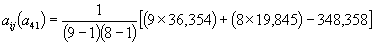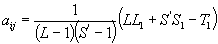 Затем рассчитывают дисперсионное отношение (15,26)2/19,96 = 11,66. Согласно таблицам Г.6.1 - Г.6.5 критическое значение, соответствующее уровню значимости 0,01/8 = 0,00125 для 8 и 63 степеней свободы, равно приблизительно 4. Это меньше экспериментального значения. Поэтому результаты для пробы 93 следует признать аномальными и отбросить. 4.3.4 Если степени свободы для отдельных проб одинаковы для всех проб, можно применять испытание по Кохрену. Критерий Кохрена будет представлять в этом случае отношение наибольшей суммы квадратов (проба 93) к сумме всех остальных сумм квадратов, т.е. 2,972/(1,132 + 0,992 +,...,+ 1,362) = 0,510. Этот результат больше критического значения 0,352, соответствующего n = 8 и v = 8 (таблица Г.3). Следовательно результаты, полученные на пробе 93, следует признать аномальными. Измененная редакция. Изм. № 1. 4.4 Оценивание результатов, заменяющих потерянные или забракованные данные4.4.1 Потерян или забракован один из двух результатов в серии повторных испытаний. Если один из пары результатов в серии повторных испытаний - дублей (уij1 или уij2) потерян или забракован, следует принять, что он имеет значение, равное значению другого результата в серии в соответствии с методом наименьших квадратов. 4.4.2 Потеряны или забракованы оба результата в серии повторных испытаний. Если оба результата в серии повторных испытаний - дублей потеряны, аij = (уij1 + уij2) следует оценивать суммой квадратов по взаимодействию «лаборатория ´ проба», включающей потерянные значения в значении суммы пар результатов всех комбинаций «лаборатория ´ проба» как неизвестные переменные. При этом следует игнорировать любую лабораторию или пробу, все результаты которой были забракованы, и использовать новые значения L и S. Оценки потерянных или отбракованных результатов находят по частным от производных этой суммы по каждой переменной, приравнивая их нулю, и последующим решением системы нормальных уравнений. Формулу (4) используют, когда следует оценить сумму одной пары. Если необходимо получить большее число оценок, можно использовать процедуру последовательного приближения. В этом случае сумму каждой пары оценивают по очереди, последовательно по формуле (4) с использованием новых значений L1, S1 и T1, которые содержат последние оценки других потерянных пар. Начальные значения для оценок могут быть основаны на подходящем среднем значении для пробы, и процесс обычно сходится к требуемому уровню точности после трех итераций. Более детальное изучение вопроса приведено в [7]. Если необходимо оценить значение суммы одной пары aij, оценку получают по формуле где S¢ = S минус число проб, признанных выпадающими согласно процедуре по 4.3; L1 - сумма оставшихся в i-й лаборатории пар результатов; S1 - сумма оставшихся для j-й пробы пар результатов; Т1 - общая сумма пар результатов, за исключением суммы потерянной пары аij. Пример - Два результата лаборатории D на пробе 1 были признаны аномальными и отброшены по 4.2.2. Поэтому а41 следует оценить. Сумма полных пар результатов, оставшихся в лаборатории D, равна 36,354. Сумма полных пар результатов, оставшихся для пробы 1, равна 19,845. Сумма всех полных пар результатов, за исключением а41, равна 348,358. Кроме того, S¢ = 8 и L = 9. Оценку а41 представляют выражением