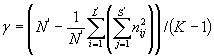 где n - число результатов, фактически полученных в i-й лаборатории на j-й пробе; Ni - число результатов, полученных в i-й лаборатории; N¢ - общее число фактически полученных результатов минус число отбракованных результатов; К - число L´S ячеек (таблица B.1), которые содержат не менее одного незабракованного результата. Если ячейки, содержащие только один результат, отсутствуют, то a = g = 2. Примечание - Выводы основаны на допущении, что эффекты обеих независимых переменных, лаборатории и пробы, являются «случайными эффектами». Пример - Для рассматриваемого примера с 8 пробами и 9 лабораториями