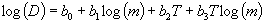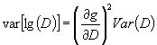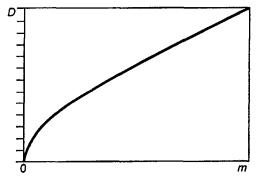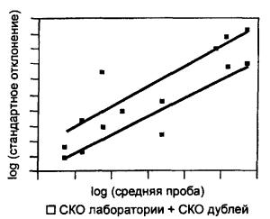 где К - постоянная величина. В этом случае все результаты следует соответствующим образом преобразовать и последующую часть анализа выполнять в терминах преобразованных результатов (Д.1). При выборе преобразования в конкретных случаях может потребоваться помощь квалифицированного статистика. На правильность решения о выборе типа преобразования по 4.6 могут влиять аномальные результаты. Пример - В таблице 1 представлены значения m, D и d с тремя значащими цифрами для восьми проб из приведенного в приложении Г примера. Соответствующие степени свободы приведены в скобках. D и d возрастают с ростом m, причем скорость возрастания падает по мере увеличения m. График зависимости этих величин в билогарифмических координатах (т.е. график зависимости log D и log d от log m) показывает, что вполне допустимо рассматривать эти точки как лежащие на двух прямых линиях (рисунок E.1). Расчеты, приведенные в Е.4, показывают, что градиенты этих линий одни и те же и оцениваются значением 0,638. Учитывая ошибки в оценке этого значения, для удобства можно принять градиент равным 2/3. Таблица 1