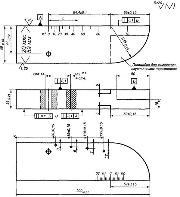 L0 - расстояние от проекции углового отражателя на рабочую поверхность образца до точки выхода при установке преобразователя в положение, при котором амплитуда эхо-сигнала от отражателя максимальна.