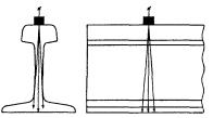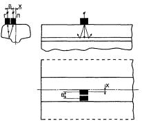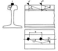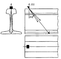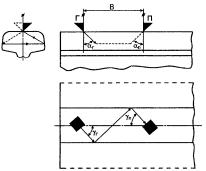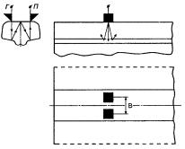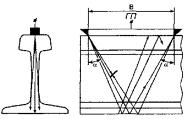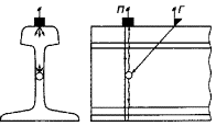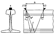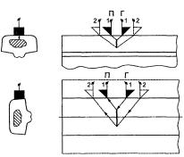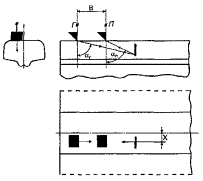 при контроле: 5.5 Условную чувствительность контроля эхо-, зеркальным и дельта-методами при частоте ультразвуковых колебаний более 1,5 МГц следует измерять по образцу СО-2Р (СО-2) или СО-3Р (рисунок 5). Условную чувствительность при контроле эхо-методом допускается измерять по стандартному образцу СО-1Р или СО-1 при температуре, указанной в аттестат-графике. Условную чувствительность при контроле эхо-, зеркальным и дельта-методами допускается измерять по отраслевым стандартным образцам или стандартным образцам предприятия. Условную чувствительность при контроле зеркально-теневым методом измеряют с помощью имитатора дефектов или аттенюатора (рисунок 1) на бездефектном участке рельса или на образце, параметры которых указаны в технической документации на контроль. При частоте ультразвуковых колебаний менее 1,5 МГц эквивалентную чувствительность следует измерять по образцам, указанным в технической документации на контроль. 5.6 Стрелу преобразователя следует определять по образцам СО-3Р (или СО-3 по ГОСТ 14782) или СО-2Р, а положение плоскости падения волны - по образцам СО-3Р или СО-3 (по ГОСТ 14782). 5.7 Угол ввода ультразвуковых колебаний следует измерять по образцам СО-3Р или СО-2Р, или СО-2. 5.8 Погрешность глубиномера следует проверять по образцам СО-3Р или СО-2Р, или СО-2. 5.9 Мертвую зону при контроле эхо-методом на частоте более 1,5 МГц следует проверять по образцам СО-3Р или СО-2Р, а при контроле на частоте менее 1,5 МГц - по образцам, указанным в технической документации на контроль. 5.10 Минимальный условный размер дефекта, подлежащий фиксации при заданной скорости контроля, следует проверять на образце в соответствии с технической документацией на контроль. Допускается при проверке применять радиотехническую аппаратуру, имитирующую сигналы от дефектов заданного условного размера. 5.11 Длительность зондирующего импульса следует определять с помощью высокочастотного осциллографа измерением длительности эхо-сигнала на уровне 0,1. Допускается определять длительность эхо-импульса на образце в соответствии с приложением В. 6 Проведение контроля6.1 Контроль рельсов проводят эхо- или зеркальным, или дельта-, или зеркально-теневым методами, или комбинацией методов продольными l и поперечными t волнами. Схемы включения и расположения преобразователей приведены в таблицах 1 (схемы 1 - 14), 2 (схемы 1 - 8) и 3 (схемы 1 - 4), где Г - вывод к генератору; П - вывод к приемнику. При применении наклонного преобразователя, работающего по совмещенной схеме, прозвучивание осуществляют последовательно в двух взаимно противоположных направлениях. Допускается применять наклонные преобразователи, с помощью которых осуществляют прозвучивание в одном направлении. 6.2 Контроль головки рельса (таблица 1) осуществляют эхо- (схемы 1, 4, 13) и зеркальным (схема 2) методами с помощью наклонных преобразователей. При частоте ультразвуковых колебаний более 1,5 МГц преобразователь включают по совмещенной или раздельной, или раздельно-совмещенной схемам и ориентируют вдоль оси или относительно продольной оси рельса в стороны его боковых граней на угол γ. Номинальные значения угла ввода α и угла γ должны указываться в технической документации на контроль. При частоте ультразвуковых колебаний менее 1,5 МГц преобразователи включают по раздельной схеме и располагают на поверхности катания го