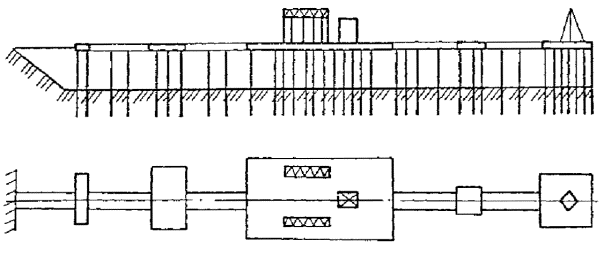 рассматривается обладающим двумя степенями свободы: перемещением V 3.3. Верхнее строение секции допускается представлять в виде жёсткого диска, если параметры секции удовлетворяют неравенству где Кvv - суммарный коэффициент горизонтальной жёсткости свайного поля секции, определяемый по п.3.5, кH/м; L - длина секции, м; EJ - жёсткость конструкции верхнего строения на изгиб в горизонтальной плоскости, кН·м2. 3.4. При определении массы секции следует учитывать: массу верхнего строения, включая массу оборудования; массу временных грузов на причале в размере 0,8 от расчётной массы; приведённую к уровню плиты массу свай и присоединённой к ним воды. Приведённую к верхнему строению массу свай и присоединённой к ним воды допускается определять по формуле