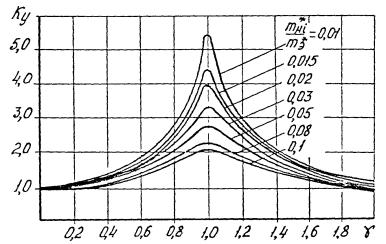 среднеквадратическое отклонение случайного эксцентриситета 5. РАСЧЕТ ПО СПЕКТРАЛЬНОМУ МЕТОДУ5.1. Расчётная сейсмическая нагрузка, действующая в направлении к-й степени свободы и соответствующая i-му тону собственных колебаний сооружения, определяется по формуле где k1 - коэффициент, учитывающий допускаемые повреждения, принимаемый для причальных сооружений равным 0,25; kψ - коэффициент диссипации, принимаемый для причальных сооружений эстакадного типа равным 1,2; mk - коэффициент инерции для k-й степени свободы динамической схемы сооружения равен, массе Mk для перемещений Vk и моменту инерции массы θk для углов поворота φk, т и т·м2; g - ускорение свободного падения, м/с2; А - коэффициент сейсмичности, принимаемый равным 0,1; 0,2; 0,4 для расчётной сейсмичности 7, 8 и 9 баллов соответственно, и уточняемый согласно п.1.3; ηki - коэффициент, зависящий от формы деформации сооружения при его собственных колебаниях по i-му тону, определяемый по формуле (5), для приближённых расчётов рекомендуется приложение 3; βi - коэффициент динамичности, соответствующий i-му тону собственных колебаний, принимаемый по рис.3. Примечания: 1. Вычисляемая по формуле (4) сейсмическая нагрузка .в зависимости от типа к-й степени свободы представляет собой: сейсмическую силу - при смещении V, и сейсмический момент - при угле поворота φ. 2. Формулы для определения сейсмических сил и сейсмических моментов, периодов и форм собственных колебаний приведены в рекомендуемом приложении 3. 5.2. Для причальных сооружений эстакадного типа коэффициенты формы следует определять по формуле где xki - относительное обобщённое перемещение сооружения в направлении k-й степени свободы (смещение V или угол поворота φ) при его собственных колебаниях по i-му тону; r - текущий номер степени свободы динамической расчётной схемы; ns - число степеней свободы, совпадающих с направлением сейсмического воздействия (число степеней свободы, характеризующих перемещения); n - общее число степеней свободы динамической расчётной схемы, включая и перемещения, и углы поворота. Рис. 3. Коэффициент динамичности β для грунтов I, II, III категории 5.3. Перемещение узла динамической расчётной схемы в направлении k-й степени свободы, обусловленное действием сейсмических нагрузок, вычисленных по формуле (4), определятся по формуле где