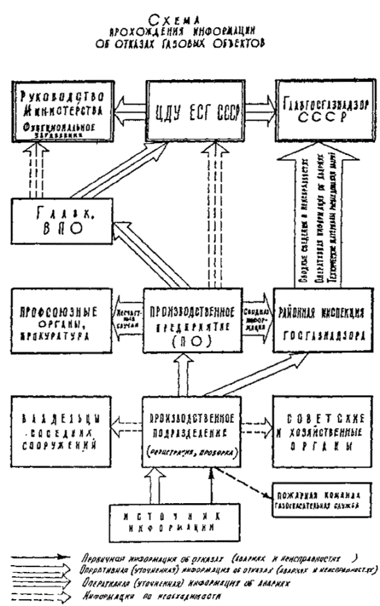 Москва 1986 Настоящее положение разработано Главным управлением государственного газового надзора в СССР во исполнение приказа Министерства газовой промышленности от 19 августа 1985 г. № 187, исполнитель - Трушкин В.И. Положение устанавливает единый порядок и организацию расследования отказов, возникших на газовых объектах, подконтрольных органам государственного газового надзора, как не повлекших, так и повлекших за собой несчастные случаи. Настоящее положение вводится взамен «Инструкции о порядке расследования аварий, повреждений и разрушение при эксплуатации и строительстве газовых объектов Мингазпрома, подконтрольных Государственной газовой инспекции», утвержденной Министерством газовой промышленности 19.08.1977 г. Положение согласовано с ЦК профсоюза рабочих нефтяной и газовой промышленности 17.02.86 г. прот. № 53 и утверждено первым заместителем Министра газовой промышленности Маргуловым Р.Д. 04.03.86 г. Срок введения в действие - 01.06.86 г. Термины и определенияАвария - внезапный отказ газового объекта (узла), вызвавший полную потерю его работоспособности. Примечание: критериями аварии являются состояния объекта (узла) в целом или его отдельных элементов, сопроводившиеся недопустимым параметрами технологического процесса нарушением режима работы объекта, поражением или созданием опасных условий для людей, окружающих зданий, сооружений и среды. Безопасность - свойство объекта (узла, элемента) не быть источником ситуаций, опасных для людей и окружающей среды (ОСТ 51.100-83). Дефект - каждое отдельное несоответствие продукции установленным требованиям (ГОСТ 15467-79). Исправное состояние - состояние объекта (узла, элемента), при котором он соответствует всем требованиям нормативно-технической документации (ГОСТ 27.002-83). Критерий отказа - отличительный признак или совокупность признаков неработоспособного состояния объекта (узла, элемента), согласно которым устанавливается факт возникновения отказа. Надежность - свойство объекта (узла, элемента) сохранять во времени в установленных пределах значения всех параметров, характеризующих способность выполнять требуемые функции в заданных режимах и условиях применения, технического обслуживания, хранения и транспортирования (ГОСТ 27.002-83). Примечание: надежность является комплексным свойством, включающим безопасность, работоспособность, долговечность, ремонтопригодность и др. Наработка до отказа - наработка объекта (узла, элемента) от начала его эксплуатации до возникновения первого отказа (ГОСТ 27.002-83). Наработка между отказами - наработка объекта (узла, элемента) от окончания до восстановления его работоспособного состояния после отказа до возникновения следующего отказа (ГОСТ 27.002-83). Неисправность - частичная потеря работоспособности объекта (узла, элемента), вызывающая необходимость облегчения режима его работы (снижения параметров технологического процесса) или внепланового проведения работ по устранению дефектов в целях сохранения или восстановления его работоспособности (безопасности). Отказ - событие, заключающееся в нарушении работоспособности объекта (узла, элемента) (ГОСТ 27. 002-83). Повреждение - событие, заключающееся в нарушении работоспособности объекта или его составных частей (узлов, элементов) вследствие внешних воздействий, не предусмотренных или превышающих уровни,