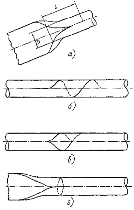 1.8. Вязкий (пластический) излом образуется в результате сдвига (среза). При вязком изломе относительное сужение площади поперечного сечения превышает 15 %. Профиль излома может иметь форму, указанную на рис. 2, б, в, г.