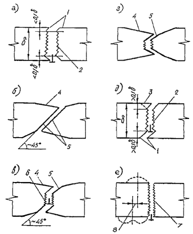 а - хрупкий излом (утяжки нет); б - пластический излом (I разновидность); в - пластический излом (II разновидность); г - пластический излом (III разновидность); д - смешанный излом; е - условно вязкий излом; 1 - губы среза; 2 - кристалличность в изломе сколом; 3 - незначительная утяжка; 4 - значительная утяжка; 5 - плоскость среза; 6 - полоска волокнистого излома; 7 - волокнистость (шиферность, слоистость); 8 - смещение сварных швов.