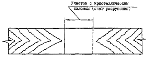 Острые углы шевронного узора всегда направлены противоположно направлению движения трещины. Схождение двух, направленных один к другому, шевронных узоров указывает на начало распространения (очаг) разрушения (рис. 3).