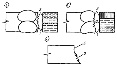 I тип - остановка без изменения направления трещины (рис. 1, а) - наиболее характерен для трубопроводов и сосудов, внутри которых находятся жидкие среды или эксплуатируемых при невысоком давлении газа, когда скорость распространения трещины незначительна по сравнению со скоростью декомпрессии рабочей среды;