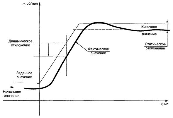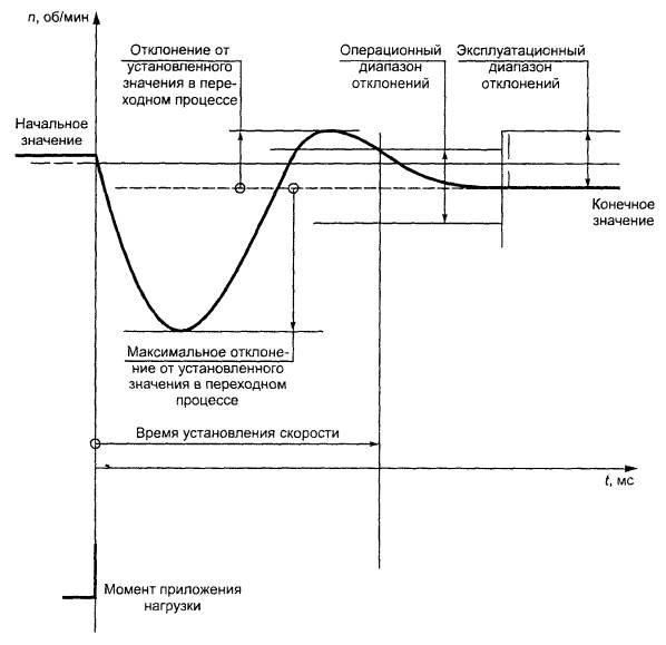 4.1.7 Электроприводы должны обеспечивать работу хотя бы в одном из режимов нагрузки, указанных в таблице 2. Класс режима нагрузки должен быть указан в ТУ на электроприводы конкретных типов. Если электроприводы выполнены для работы в различных режимах нагрузки, то для каждого режима должно быть указано значение тока. Допускается на электроприводы конкретных типов устанавливать более жесткие требования к режимам нагрузки, что должно быть указано в ТУ на электроприводы конкретных типов. Если класс режима нагрузки электроприводов не соответствует установленным в таблице 2, то номинальный ток должен быть фактической величиной цикла повторяющегося режима работы, взятого за время наиболее нагруженного пятнадцатиминутного периода, если иное не указано в ТУ на электроприводы конкретных типов. 4.1.8 Диапазон регулирования скорости двигателя, входящего в состав электропривода, измеряемый как отношение максимальной скорости к минимальной, должен быть следующим: - для электроприводов с регулированием ЭДС - не менее 25:1; - для электроприводов с регулированием скорости - не менее 50:1; - для электроприводов с регулированием по другим параметрам должен быть выбран из ряда отношений: 10:1; 50:1; 100:1; 200:1; 500:1; 1000:1; 10000:1. 4.1.9 В ТУ на электроприводы конкретных типов должны быть определены характеристики электропривода в установившемся режиме для регулируемых переменных величин, являющихся основными в конкретных условиях применения. Такими переменными величинами могут быть ток, напряжение, мощность и другие параметры электропривода. Диапазон эксплуатационных отклонений не должен быть превышен при любых сочетаниях применяемых эксплуатационных условий в любое время в течение одночасового интервала, взятого после периода прогрева, определяемого изготовителем электропривода в ТУ на электроприводы конкретных типов. 4.1.11 В ТУ на электроприводы конкретных типов должны быть установлены следующие характеристики в соответствии с приложением А: - время реверса тока - не более 0,03 с (рисунок А.2); - допустимый диапазон значений отклонения скорости от значения заданного сигнала - по п. 4.1.10 при постоянной нагрузке (рисунок А.4). Дополнительно могут быть установлены следующие характеристики: - время установления скорости при ступенчатом увеличении нагрузки и при отсутствии ограничений в системе регулирования не более 0,12 с (рисунок А.3); - время установления скорости при ступенчатом увеличении заданного входного сигнала и постоянной нагрузке (рисунок А.4); - значение отклонения скорости от значения заданного входного сигнала при его изменении и постоянной нагрузке (рисунок А.5). 4.1.12 Система импульсно-фазового управления преобразователя электроприводов должна обеспечивать: - требуемый сдвиг изменения фазы управляющих импульсов во всех режимах работы электропривода; - ограничение угла управления на требуемом уровне. Допустимая асимметрия управляющих импульсов по фазам не должна превышать 3 электрических градуса, изменение фазы импульсов при отсутствии управляющего воздействия не должно превышать 1,5 электрического градуса. 4.1.13 Система регулирования электроприводов должна обеспечивать: - регулирование разгона и торможения; - ограничение тока во всех режимах работы; - отсутствие вращения якоря двигателя при всех предусмотренных возмущающих воздействиях и 
