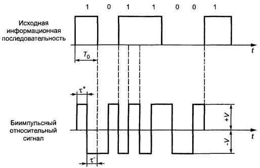 Символ «1» информационной последовательности соответствует биимпульсному сигналу 10 или 01, совпадающему с предыдущим, а символ «0» - биимпульсному сигналу 10 или 01, инверсному по отношению к предыдущему биимпульсному сигналу.