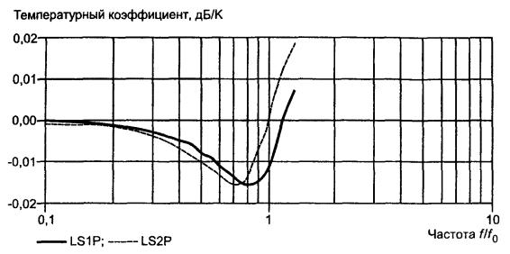 Суммарный температурный коэффициент является линейной комбинацией как влияния изменения импеданса замкнутого объема воздуха, так и влияния изменения механического натяжения. Низкочастотное значение температурного коэффициента обычно находится в пределах ± 0,005 дБ/К как для микрофона типа LS1P, так и для микрофона типа LS2P. Температурный коэффициент, показанный на рисунке Г.2, нельзя применить для любого микрофона.