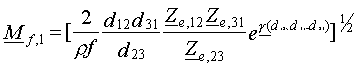 где Отсюда, произведение чувствительностей микрофонов по свободному полю будет Примечание - Правая часть уравнения (6) представляет собой отношение электрического передаточного импеданса к акустическому передаточному импедансу на расстоянии их акустических центров в отсутствие микрофонов. 5.7 Окончательные уравнения для чувствительности микрофона по свободному полю5.7.1 Метод с использованием трех микрофонов Обозначают