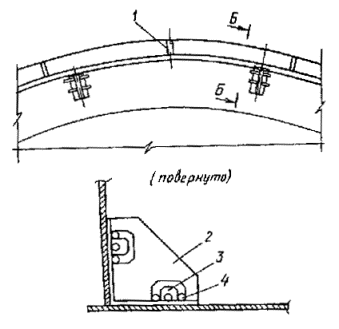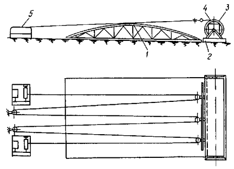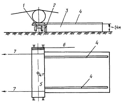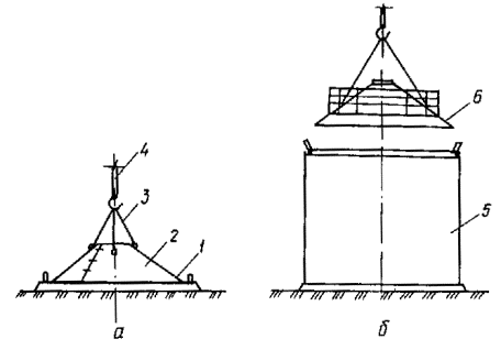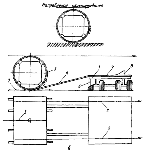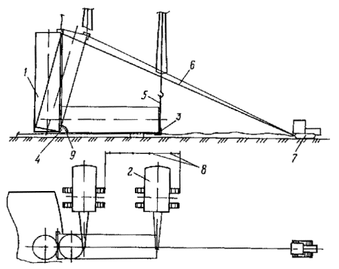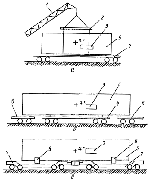 2. ПРИЕМКА ОСНОВАНИЙ И ФУНДАМЕНТОВ2.1. При приемке основания и фундамента должны быть проверены: правильность разбивки осей резервуара; наличие обозначенного центра основания (в центре должен быть забит знак из трубы диаметром Ду 40 мм на глубину 500 - 600 мм); соответствие уклона основания проектному; отметки поверхности основания и фундамента; обеспечение отвода поверхностных вод от основания; соответствие гидроизоляционного слоя проектному; соответствие фундамента под шахтную лестницу проектному. 2.2. Отклонения фактических размеров оснований и фундаментов резервуаров от проектных не должны превышать величин, приведенных в табл. 17 СНиП 3.03.01-87 (см. обязательное приложение 1). 3. ТРАНСПОРТИРОВАНИЕ. РАЗГРУЗКА И СКЛАДИРОВАНИЕ МЕТАЛЛОКОНСТРУКЦИЙ3.1. Рулонированные конструкции высотой до 12 м транспортируются на четырехосных железнодорожных платформах грузоподъемностью 60 т (черт. 1, а). 3.2. Для транспортирования рулонов высотой 18 м целесообразно использовать железнодорожные транспортеры сцепного типа грузоподъемностью 120 т (черт. 1, в). Рулонированные конструкции высотой 18 м можно перевозить также на железнодорожной четырехосной платформе грузоподъемностью 60 т с двумя платформами прикрытия. В этом случае необходимо обеспечить одновременное отправление нескольких рулонов, тогда каждая платформа прикрытия перекрывает концы двух рулонов (черт. 1, б). 3.4. При погрузке на железнодорожные транспортеры сцепного типа рулоны укладываются в ложементы, находящиеся друг от друга на расстоянии по осям 12,36 м. Поверхность соприкосновения ложемента с рулоном выстилается досками длиной 1 м и толщиной не менее 30 мм, а крепление рулона к ложементу производится бандажами из полосовой стали с помощью инвентарных винтовых стяжек. 3.5. Элементы резервуарных конструкций (щиты покрытий, элементы колец жесткости и опорных колец, короба понтонов и плавающих крыш и др.) перевозят на железнодорожных платформах и в полувагонах в специальных контейнерах или без них и закрепляют способами и средствами, исключающими их деформацию. Перевозка рулонов железнодорожным транспортом: а - перевозка рулона высотой 12 м на четырехосной платформе (разгрузка с помощью крана); б - перевозка рулона высотой 18 м на четырехосной платформе с двумя платформами прикрытия; в - перевозка рулона высотой 18 м на сцепном транспортере 1 - самоходный кран; 2 - разгрузочная траверса; 3 - место маркировки рулона; 4 - четырехосная железнодорожная платформа; 5 - рулон; 6 - платформа прикрытия; 7 - сцепной транспортер; 8 - неподвижный ложемент; 9 - подвижный ложемент Черт. 1 Мелкие детали (болты, гайки, соединительные элементы ограждений, патрубки и др.) укладывают в специальные ящики. 3.6. Конструкции резервуара, подлежащие перевозке в пределах сети железных дорог СССР на общих условиях, не должны превышать общесетевого габарита погрузки, установленного МПС СССР. Металлические конструкции длиной, не превышающей габариты платформ и полувагонов, допускается грузить на все железные дороги, кроме Дальневосточной, по льготному габариту погрузки. В накладной на такие грузы отправитель делает отметку "Льготный габарит". 3.7. Перевозка негабаритных или тяжеловесных металлических конструкций производится в соответствии с "Инструкцией по перевозке негабаритных и тяжеловесных грузов на железных дорогах СССР коле