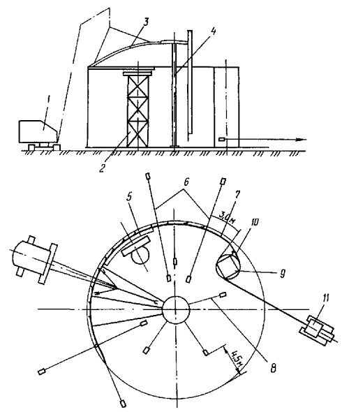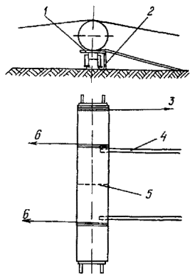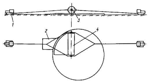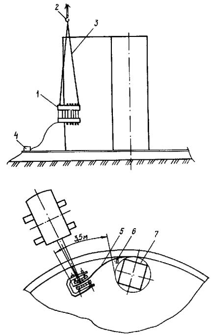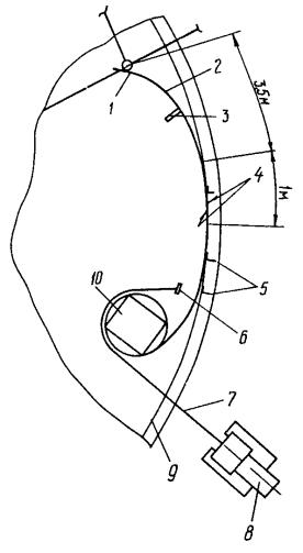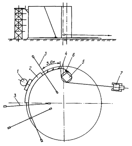 2. На прямой линии, отклоненной от касательной к уторной окружности на угол не более 30° и на расстоянии 15 - 35 м от основания данной образующей устанавливается теодолит.