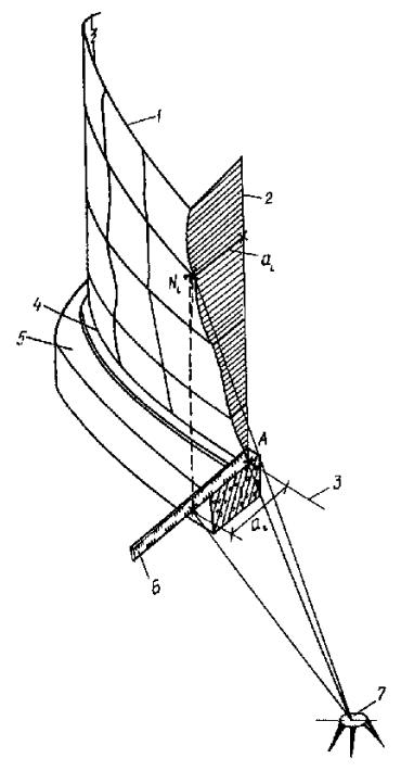 1 - стенка резервуара; 2 - теоретическая вертикаль к уторной окружности в точке А; 3 - касательная к уторной окружности в точке А; 4 - уторная окружность; 5 - железобетонное фундаментное кольцо; 6 - линейка (рейка), установленная по нормали к касательной; 7 - теодолит; Ni - точки визирования; ai - отклонения от вертикали точек Ni