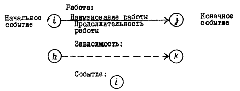 ЭЛЕМЕНТЫ ЛОКАЛЬНОГО СЕТЕВОГО ГРАФИКА: работа - процесс, требующий для его выполнения затрат времени и ресурсов; ожидание - технологический или организационный перерыв между работами, необходимый при выбранной схеме производства работ; процесс, требующий только затрат времени; зависимость (фиктивная работа) - элемент, который вводится для отражения правильной взаимосвязи между работами; не требует затрат времени и труда исполнителей; событие - результат выполнения (факт окончания) одной или нескольких работ, необходимый и достаточный для начала последующих работ. Работа и ожидание изображаются сплошной стрелкой с указанием над стрелкой ее продолжительности или ожидания. Зависимость (фиктивная работа) изображается пунктирной стрелкой. Событие изображается кружком и нумеруется. Работа, а также ожидание и зависимость шифруется номерами двух ограничивающих событий, начального и конечного: