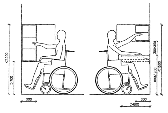 Оборудование настенными полками-столами В помещении регистрации больных для организации самостоятельной предварительной записи к врачам следует предусмотреть удобное место для инвалида на коляске. В зонах ожидания перед врачебными кабинетами следует предусматривать место для размещения инвалида на коляске.
