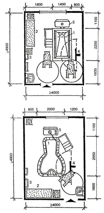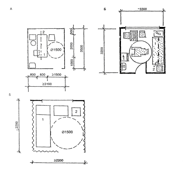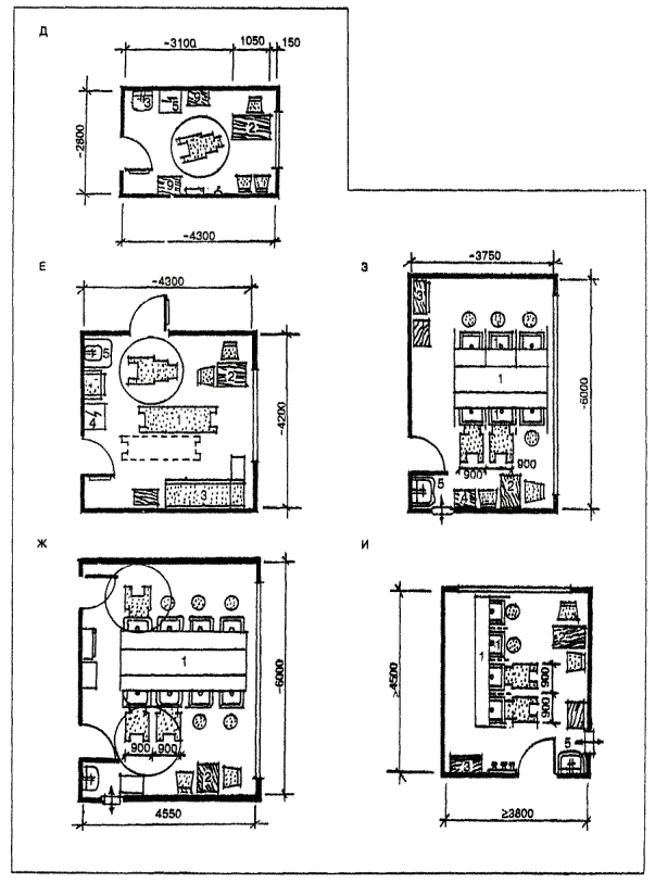 Планировочные решения различных медицинских кабинетов с учетом оказания услуг в них инвалидам А - кабинет главного врача; Б - кабинет врача; 1 - кушетка; 2 - умывальник; 3 - стол; 4 - шкаф; 5 – тумбочка; В - кабинет гинеколога; Г - кабинет зубного врача; Д - кабинет старшей медсестры; 1 - кушетка; 2 - стол врача; 5 - умывальник; 4 - стерилизатор; 5 - холодильник; 6 - медоборудование; 7 - кресло стоматологическое; 8 - шкаф; 9 - тумбочка; 10 - кресло гинекологическое; 11 - стерилизационное помещение