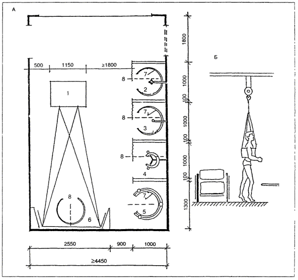 Пример планировочного решения душевого зала А - водолечебная кафедра с набором душей; 1 - кафедра; 2 - пылевой душ; 3 - дождевой душ; 4 - восходящий душ; 5 - циркулярный душ; 6 - струевой душ; 7 - поручень и упоры для коленей; 8 - оборудование для перемещения инвалида; Б - вариант специального оборудования В помещении подводного душа-массажа рекомендуется устройство специального оборудования для перемещения инвалида из коляски в ванную.