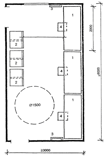 Вариант планировки помещения для занятий лечебной физкультурой 1 - свободная зона для упражнений; 2 - стол преподавателя; 3 - гимнастическая стенка; 4 - гимнастические скамейки