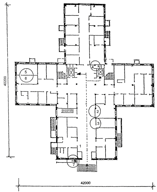 Кроме названных критериев оценки проектов поликлиник, к внутренним пространствам (вестибюлям, коридорам, кабинетам, санузлам и др.) в АПЗ и задании на проектирование могут быть предъявлены особые требования по габаритам помещений и расстановке основного оборудования и дополнительного оборудования для маломобильных групп населения: поручней, ручек, вешалок, специального покрытия полов, звуковой и наглядной информации и др. Эти требования могут быть реализованы в процессе внутренней отделки здания, при частичной его модернизации. При привязке проекта, в реальных условиях строительства должны решаться вопросы устройства пандусов при входных группах помещений, увеличения тамбуров и т.д. В приведенных ниже примерах планировочных решений поликлиник в кружках указаны помещения (зоны), подлежащие перепланировке (адаптации). Поликлиника на 250 посещений в смену (типовой проект 252-4-42.84) является примером сооружения с четкой структурой плана, позволяющей легко ориентироваться инвалидам. Для адаптации здания поликлиники к посещению инвалидами необходимы наружные входные пандусы и частичная перепланировка помещений (увеличение санузла, выделение зоны для самозаписи инвалидов к врачам, увеличение кабинета гинеколога, устройство лифта).