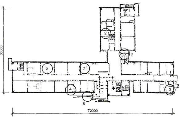 План 1 -го этажа 1 - вестибюль; 2 - гардероб; 3 - санузлы; 4 - помещение для взятия проб крови; 5 - регистратура; 6 - пандус Поликлиника на 380 посещений в смену (типовой проект 251-4-55.87) может быть доступна для маломобильного населения при условии организации пандуса при входе, увеличения и перепланировки ряда помещений, кабинетов, вестибюля с гардеробной, регистратуры, помещения для взятия проб крови, санузла.