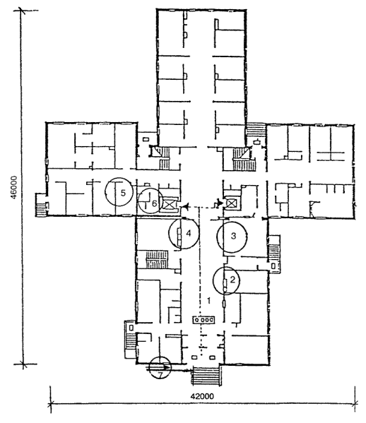 План 1 -го этажа 1 - вестибюль, 2 - регистратура; 3 - гардероб; 4 - санузлы; 5 - комплекс водных процедур; 6 - пандус Поликлиника на 600 посещений в смену (типовой проект 252-4-35.83) является примером сооружения, где необходимы: устройство пандуса при входе, перенос регистратуры ближе к вестибюльной зоне, увеличение площади гардероба, санузлов, кабинета взятия проб крови. После переработки здание становится доступным для маломобильной части населения.