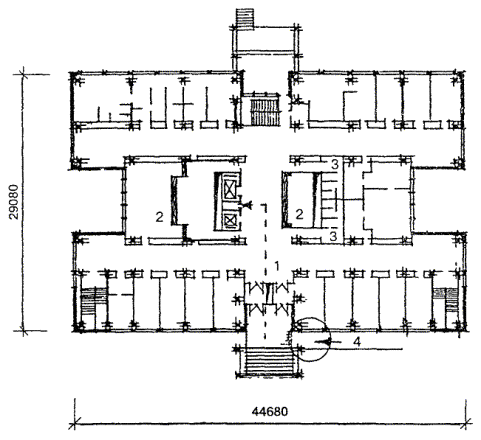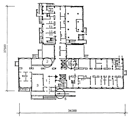 План 1 -го этажа 1 - вестибюль; 2 - гардероб; 3 - регистратура; 4 - санузел; 5 - пандус Поликлиника на 750 посещений в день (типовой проект VII-79) является примером ЛПУ, возводящихся в настоящее время в районах новостроек Москвы. После устройства пандуса при входе здание может быть использовано маломобильными группами населения.