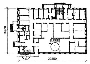 План 1-го этажа 1 - торговый зал; 2 - пандус Типовой проект 254-8-25 служит примером аптеки, в которой необходимы устройство пандуса при входе, а также расстановка оборудования в торговом зале, удобного для пользования им инвалидами на колясках и другими маломобильными группами населения.