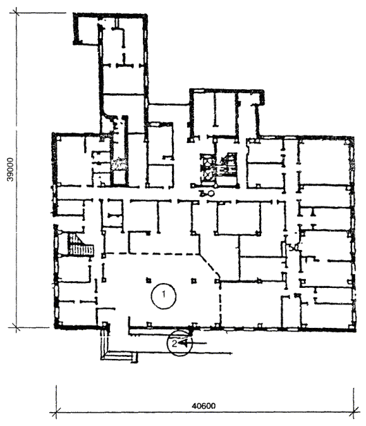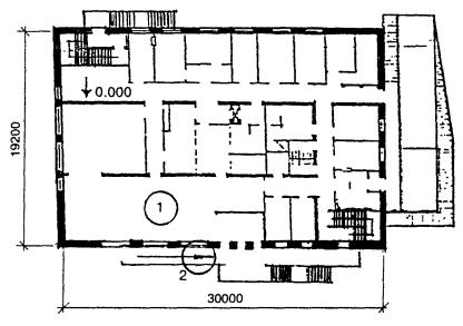 План 1 -го этажа 1 - торговый зал; 2 - пандус Пример включения медпункта и аптечного киоска в жилом образовании Центра обслуживания нетрудоспособных людей в состав жилого комплекса для престарелых и инвалидов в жилом микрорайоне «Зие-мельблазма» в г. Риге.