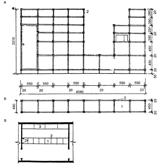 Аптечный прилавок, позволяющий расположить товар на уровне видимости инвалида в кресле-коляске А - вид спереди; Б - план; В - пример расположения в помещении; 1 - полка из стекла; 2 - несущий каркас; 3 - шкафы с товаром Пример устройства аптечного прилавка, состоящего из трех частей, с учетом потребностей инвалида на кресле-коляске. Стеклянная витрина позволяет расположить товар на полках в несколько ярусов в поле зрения инвалида в кресле-коляске. Низкий прилавок, состоящий из откидной доски, служит местом обслуживания инвалида, а в нерабочем положении является проходом для продавца. Место для продавца с кассовым аппаратом - стандартное решение торгового оборудования.