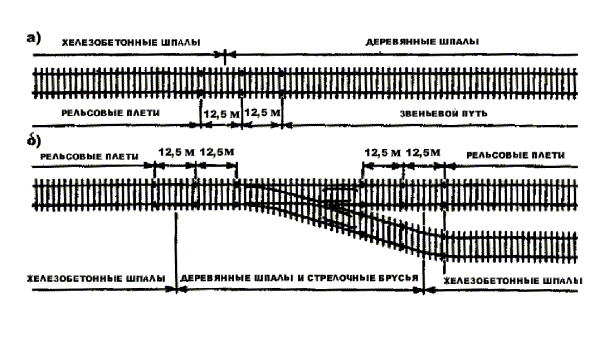 где а - расстояние от неподвижного конца плети до i-й риски (50, 100, 150 м и т.д.). Работы по принудительному вводу плетей в оптимальную температуру выполняются в соответствии с Правилами и технологией выполнения основных работ при текущем содержании пути. 4.7.7. Закрепление плетей производится после полного их удлинения, совпадения всех промежуточных расчетных рисок с контрольными и снятия на каждой 15-й шпале роликов или пластин. Если на отдельных участках расчетные риски не совпадают с контрольными более чем на 5 мм, в пределах этих участков на плети дополнительно воздействуют ударными приборами. 4.7.8. Плеть закрепляют от ее неподвижного конца к подвижному. Для более точного и быстрого фиксирования температуры закрепление плетей осуществляется на протяжении Nt/r подвижного конца плети - на каждой шпале и на каждой пятой шпале - на остальном протяжении, после чего снимают ГНУ, собирают стыки и открывают движение поездов со скоростью 25 км/ч. Затем плети закрепляют на остальных шпалах и отменяют предупреждение об уменьшении скорости движения поездов. 4.7.9. Нагревательные установки применяют при удлинении плетей длиной не более 1000 м с вывешиванием на пластины. В этом случае нагрев осуществляется в одном направлении от неподвижного конца к подвижному с обязательным устройством на неподвижном конце анкерного участка. При длинах плетей более 1000 м нагрев осуществляется полуплетями от середины к концам плетей. Закрепление плетей при нагреве производится вслед за проходом нагревательной установки при совпадении расчетных рисок на плети с контрольными на подкладках (через 50 м). 4.7.10. Работы по вводу плетей в оптимальную температуру, с использованием натяжных устройств и нагревательных установок должны быть занесены в Журнал или Паспорт-карту с указанием даты проведения работ, температуры рельсовых плетей в момент производства работы, расчетных и фактических удлинений плетей (полуплетей) и полученной при этом их температуры закрепления в зависимости от фактического удлинения. 5. СВАРКА ПЛЕТЕЙ СО СТРЕЛОЧНЫМИ ПЕРЕВОДАМИ5.1. При укладке на путях 1-2-го классов и внеклассных стрелочных переводов на железобетонных брусьях рельсовые стыки в пределах этих переводов должны быть, как правило, сварены, а изолирующие стыки в пределах переводной кривой должны иметь утвержденную конструкцию. Следует стремиться к сварке переводов с примыкающими к ним рельсовыми плетями бесстыкового пути. 5.2. Технические условия и технологии сварки рельсов в пределах стрелочных переводов, сварки их с примыкающими плетями, конструкция пути на подходах к крестовинам с подвижным сердечником и конструкция изолирующих стыков в таких переводах должны быть утверждены ЦП МПС. 6. ОСОБЕННОСТИ КОНСТРУКЦИИ, УКЛАДКИ И СОДЕРЖАНИЯ БЕССТЫКОВОГО ПУТИ В СУРОВЫХ КЛИМАТИЧЕСКИХ УСЛОВИЯХ СЕВЕРА, СИБИРИ И ДАЛЬНЕГО ВОСТОКА6.1. ОБЩИЕ ПОЛОЖЕНИЯ6.1.1. Регионы Севера, Сибири и Дальнего Востока относятся к участкам с высокими годовыми амплитудами температур рельсов, которые на отдельных участках могут достигать 120 °С. Причем отношение среднесезонных значений максимальных летних и минимальных зимних значений температур воздуха к их абсолютным экстремальным значениям составляет соответственно 0,82-0,92 и 0,85-0,92, тогда как для Европейской части России они находятся на уровне 0,8 и 0,6-0,7. К особеннос