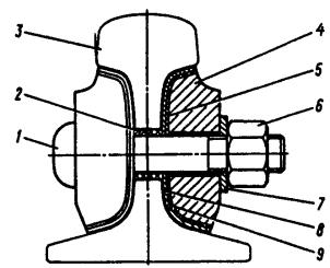где L - измеренная при данной температуре длина плети, м; t - температура рельса в момент измерения длины плети, °С. Рис. 2.3. Высокопрочный изолирующий стык АпАТэк-Р65М-К: 1 - болт; 2 - изоляционная втулка; 3 - рельс; 4 - металлическая накладка; 5 - изоляционная прокладка; 6 - гайка; 7 - шайба; 8 - клеящая паста; 9 - металлическая обечайка. Для плети длиной 1000 м в табл. 2.1 даны значения поправок, вычисленные по приведенной выше формуле. При определении значения поправки для другой (фактически измеренной) длины плети поправку, взятую из табл. 2.1, следует умножить на отношение измеренной длины плети, м, к 1000 м. При других значениях температур поправку определяют интерполяцией. Стыки, сваренные в РСП, отмечаются двумя вертикальными полосами, которые наносят на шейку рельса внутри колеи симметрично оси стыков на расстоянии 10 см от них. На каждой плети в РСП отмечают ее середину вертикальной полосой на шейке рельса. После укладки плети в путь дополнительно к ранее нанесенной маркировке наносят номер плети по проекту с указанием сторонности, дату укладки и температуру плети при закреплении ее на подкладках. В результате маркировка на рельсах принимает вид: 44 - 361 - 799,45 - 16 л - 06.04.99 + 29°, где 44 - номер РСП; 361 - номер плети по сварочной ведомости; 799,45 - длина плети, м; 16л - номер плети по проекту и ее сторонность; 06.04.99 + 29° - дата укладки и температура закрепления. Длины плетей более 800 м записываются после приведенной маркировки в начале и конце плети. Таблица 2.1. Поправки, вводимые при измерении 1000-метровой плети при различной температуре.