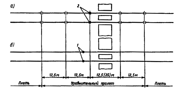2.6. СОЕДИНЕНИЕ РЕЛЬСОВЫХ ПЛЕТЕЙНа Калининградской, Юго-Восточной, Северо-Кавказской, Приволжской железных дорогах должны укладываться по две пары, а на остальных дорогах, в том числе и на дорогах Сибири - по три пары уравнительных рельсов длиной 12,5 м. При устройстве в уравнительном пролете сборных изолирующих стыков, в том числе со стеклопластиковыми накладками, укладываются четыре пары уравнительных рельсов с расположением изолирующих стыков в середине уравнительных пролетов или три пары рельсов с размещением в середине второй пары рельсов изолирующих стыков, обеспечивающих сопротивление разрыву не менее 1,5 МН. В случае примыкания бесстыкового пути к звеньевому или к стрелочным переводам, не ввариваемым в плети, на примыкании должны быть уложены две пары уравнительных рельсов длиной по 12,5 м. На участках, не оборудованных тональной автоблокировкой, плети длиной до перегона соединяются с помощью рельсовой вставки с высокопрочным изолирующим стыком, которая сваривается с концами рельсовых плетей. Не допускается расположение стыков в пределах переездного настила. Схема расположения уравнительных рельсов на переезде показана на рис. 2.4. Рис. 2.4. Схемы расположения уравнительного пролета на переезде: а - со сборными изолирующими стыками; б - с высокопрочными изолирующими стыками: 1 - высокопрочный изолирующий стык; 2 - сборный изолирующий стык Общая длина уравнительного пролета, см, при оптимальной температуре укладки составит: при двух парах уравнительных рельсов 1 = 1250 + 1250 + 3 = 2503; при трех парах уравнительных рельсов 1 = 1250 + 1250 + 1250 + 4 = 3754; при четырех парах уравнительных рельсов 1 = 1250 + 1250 + 1250 + 1250 + 5 = 5005. 2.6.2. В случаях временного закрепления плетей при температурах выше оптимальной, общая длина l1 см, укладываемых в уравнительный пролет укороченных рельсов, включая сумму зазоров, зависит от разности оптимальной температуры и температуры укладки Dt и суммарной длины L, см, двух смежных (коротких) полуплетей: