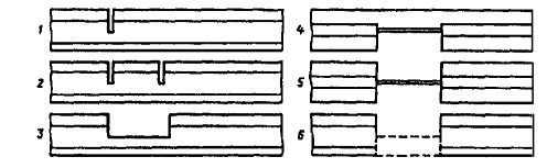 Примечание. Расчетные температуры рельсов могут корректироваться при наличии более точных данных наблюдений на местах, корректировка этих температур должна быть согласована ЦП МПС. ПРИЛОЖЕНИЕ 4ТЕХНОЛОГИЧЕСКИЕ УКАЗАНИЯ ПО ВОССТАНОВЛЕНИЮ ДЕФЕКТНЫХ РЕЛЬСОВЫХ ПЛЕТЕЙП.4.1. Определение размеров внутренних дефектов в головке При обнаружении в головке рельсовой плети дефектов 20.2, 21.2 для решения вопроса о возможности оставления дефектного места в пути с установкой на это место накладок необходимо с помощью съемного ультразвукового дефектоскопа определить границы распространения внутренней трещины относительно рабочей грани головки рельса и уточнить место расположения дефекта по длине рельса. При работе дефектоскопа тщательно очищают поверхность катания и смачивают ее в зоне поиска дефекта водой, а при отрицательной температуре - водным раствором спирта. Искатель многократно перемещают по поверхности катания вдоль рельса на длине около 20 см с каждой стороны дефекта, направляя пучок ультразвуковых колебаний вдоль продольной оси рельса. Первый проход искателя начинают от внутренней грани головки, последующие - с шагом сканирования 2-3 мм до установления границы распространения трещины в поперечном направлении головки (условной ширины трещины). П.4.2. Временное восстановление рельсовых плетей При выполнении работ по временному восстановлению рельсовых плетей в перерывах между поездами (без закрытия перегона), ограждаемых сигналами остановки, необходимо учитывать особенности данной работы и руководствоваться следующими технологическими указаниями. Для пропуска поезда по дефектному месту, а также по месту, где выполняют вырезку рельса, ставят накладки, прикрепляемые струбцинами в соответствии с п. 4.5. Перед проходом поезда рельсорезный станок снимают и на место пропила ставят накладки, прикрепляемые со стороны вырезаемого рельса струбцинами, а со стороны плети - болтом, для которого заранее просверливают отверстие в шейке рельса. Для ускорения постановки накладок их заранее устанавливают на небольшом расстоянии от места пропила и прикрепляют одной струбциной. Перед пропуском поезда струбцину ослабляют и накладки сдвигают вдоль пазухи рельса, перекрывая место пропила и стягивая их струбциной и болтом. Перед вырезкой дефектного места следует тщательно измерить длину рельса, подготовленного к укладке. Расстояние между двумя пропилами должно равняться длине вставляемого рельса плюс два зазора. Положение второго пропила на плети намечается только после полного температурного перемещения ее концов в месте первого пропила. Рис. П.4.1. Последовательность вырезки автогеном рельса из рельсовой плети: 1-3 - расположение резов при виде сбоку; 4-5 - расположение резов в плане; 6 - последовательно выжигаемая часть шейки рельса (обозначена пунктирной линией) При температуре рельсовой плети, превышающей температуру ее закрепления, временное восстановление производят на закрытом для движения перегоне (в "окно") или в технологическое время, предусмотренное в графике движения поездов. При такой температуре плети в ней действуют сжимающие силы, затрудняющие резание. В таких случаях рекомендуется сначала вырезать газовым резаком кусок рельса длиной 10-20 см в месте дефекта, а затем рельсорезным станком обрезать концы плетей на треб