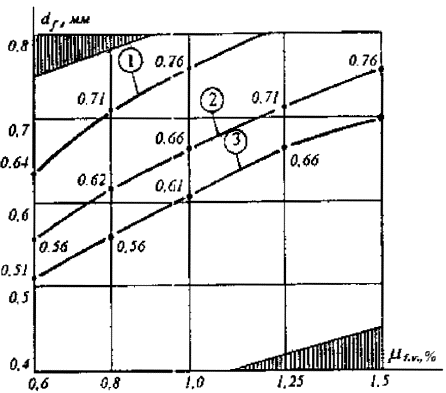 где S - размер ячейки в свету (равный 84-88 мм) арматурной сетки конструкции ограждения. 5.1.21. Область применения фракций крупного заполнителя - щебня (п. 5.1.9) в зависимости от величины диаметров используемых фибр и коэффициента фибрового армирования определяют по графику (черт. 1). Содержание щебня должно составлять 20+25% от общей массы заполнителей в СФБ-смеси. Окончательно зерновой состав и расход щебня устанавливают опытным путем с учетом технологических методов приготовления СФБ-смеси, ее транспортирования и укладки. Черт. 1. Области применения фракций крупного заполнителя: 1-2-3