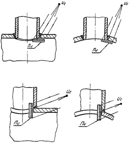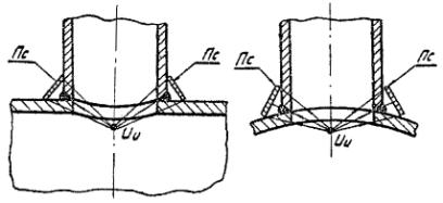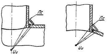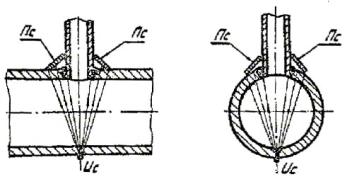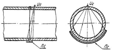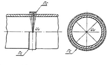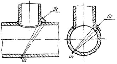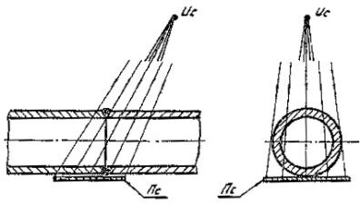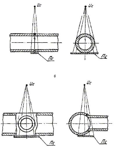 3.6. При просвечивании сварных швов без усиления (или со снятым усилением) на их границах необходимо устанавливать свинцовые стрелки или другие ограничители, обеспечивающие определение местонахождения шва на радиографическом снимке. 3.7. Эталоны чувствительности устанавливают: канавочные вдоль сварного шва на расстоянии не менее 5 мм от него, а проволочные и пластинчатые - на усиление сварного шва. При панорамном просвечивании кольцевых швов трубопроводов на рулонную радиографическую пленку за одну установку источника излучения устанавливают не менее четырех эталонов чувствительности, по одному на каждую четверть длины окружности сварного соединения в местах, наиболее удобных для расшифровки снимка. 3.9. Изображения имитаторов, позволяющих визуально или инструментально определять глубину дефектов, а также эталонов чувствительности, служащих одновременно и имитаторами, должны быть на каждом снимке, либо на каждом участке снимка длиной около 350 мм при просвечивании на рулонные пленки. 3.10. При контроле кольцевых сварных швов диаметром менее 100 ми допускается устанавливать канавочные эталоны чувствительности на расстоянии не менее 5 мм от шва с направлением канавок вдоль шва. 3.11. Если при просвечивании разнотолщинных соединений суммарная толщина канавочного эталона чувствительности и контролируемого металла сварного соединения в месте установки эталона меньше максимальной толщины контролируемого металла сварного соединения и разность оптических плотностей их изображений при этом превышает 1,0 е.о.п., то канавочные эталоны следует устанавливать на прокладку, компенсирующую разность толщин. 3.12. При просвечивании «на эллипс» эталоны чувствительности располагают между контролируемым изделием и источником излучения. 4. СХЕМЫ ПРОСВЕЧИВАНИЯ СВАРНЫХ СОЕДИНЕНИЙ4.1. Кольцевые швы трубопроводов, переходов и трубных узлов (приварки тройников, отводов) просвечивают по одной из четырех схем в зависимости от геометрических размеров труб, типа и активности применяемого источника излучения. Схемы просвечивания представлены на рис.2-5. Рис. 2. Схема панорамного просвечивания изнутри трубы за одну установку источника излучения 4.2. Криволинейные швы тройников и отводов можно просвечивать по одной из схем, представленных на рис. 5-10, в зависимости от диаметров свариваемых патрубков, их соотношений, условий доступа к шву. Примечание. На рис. 2-10 использованы следующие обозначения: Ии и Ис - источники излучения, расположенные соответственно изнутри и снаружи контролируемой сварной трубной конструкции; По и Пи - пленки, расположенные соответственно снаружи и изнутри контролируемой сварной трубной конструкции. Рис. 3. Схема фронтального просвечивания через две стенки за три установки источника излучения 4.3. При просвечивании по схемам, представленным на рис. 2, 6 и 7, используют любые рентгеновские аппараты и источники радиоактивного излучения, максимально допустимую начальную активность, которых выбирают в соответствии с табл.1 обязательного приложения 7. 4.4. При просвечивании по схемам, представленным на рис. 3, 8-10, используют любые рентгеновские аппараты и источники радиоактивного излучения, максимально допустимую начальную активность, которых выбирают в соответствии с табл.2 обязательного приложения 7. Фокусное расстояние при прос