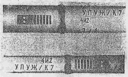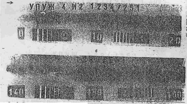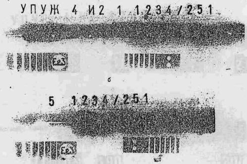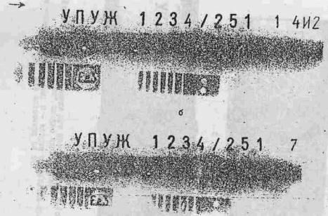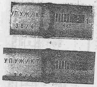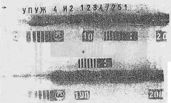 Приложение 6Обязательное Примеры маркировки радиографических снимков1. На снимках (рис. 1, а, б) при просвечивании стыка трубопровода Уренгой-Помары-Ужгород (УПУЖ) диаметром 1420 мм на форматную пленку без использования мерительного пояса (клеймо бригады сварщиков 4, шифр дефектоскопа И2, номер стыка 1234/251) должно быть изображение следующей маркировки: на первом снимке (рис. 1, а) ® УПУЖ 4 И2 1 1234-251 или ® УПУЖ 4 И2 1 1234/251; на любом другом снимке, например 5, УПУЖ 5 1234/251. 2. При использовании мерительного пояса (рис. 2) эта маркировка соответственно принимает следующий вид: ® УПУЖ 4 И2 1234/251 и УПУЖ 1234/251 на остальных снимках. 3. При использовании рулонной пленки с получением изображения всего стыка (рис. 3) на одном снимке маркировка имеет следующий вид: ® УПУЖ 4 И2 234/251. Рентгенографические снимки (позитивы), имеющие маркировку в соответствии с требованиями настоящего стандарта, представлены на рис. 1-3. Примечание. В указанных примерах маркировки шифр (клеймо) бригады сварщиков и шифр дефектоскописта, номер пленки могут проставляться простым карандашом после проявления проэкспонированных пленок (рис. 4-9). Рис. 1. Пример маркировки при просвечивании сварного соединения на форматную пленку без использования мерительного пояса: а - первого снимка, б - любого другого снимка (например - 5) Рис. 2. Пример маркировки при просвечивании сварного соединения на форматную пленку с использованием мерительного пояса: а - первого снимка; б - любого другого снимка. Рис. 3. Пример маркировки при просвечивании сварного соединения на рулонную пленку. Рис. 4. Пример маркировки при просвечивании сварного соединения на форматную пленку без мерительного пояса с записью ряда обозначений простым карандашом: а - первого снимка; б - любого другого (например, 7)