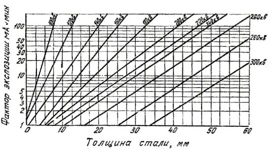 Примечание. Поправочные коэффициенты для изотопов селен-75 и тулий-170 соответствуют тем же значениям, которые приведены для иридия-192 в таблице приложения 8, но интервалы по времени составляют 11 и 12 дней вместо одной недели для иридия-192. Пример. Начальная активность изотопа Se75 составляла 4 кюри, с момента его зарядки прошло 33 дня; для нахождения поправочного коэффициента определяем количество недель (33/11=3 недели), за которое происходит аналогичное относительное снижение относительной активности иридия-192. По таблице приложения 8 для 3-х недель поправочный коэффициент составляет 0,821. Следовательно, активность изотопа селн-75 через 33 дня составит: 4 Кюри × 0,821 » 3,3 Кюри. Приложение 9Рекомендуемое Рис. 1. Номограмма для определения времени экспозиции при просвечивании стали рентгеновскими аппаратами непрерывного действия на пленку типа РГ-СШ (чувств. - 25 1/р) при фокусном расстоянии 700 мм и при различных напряжениях на трубке рентгеновского аппарата Рис.