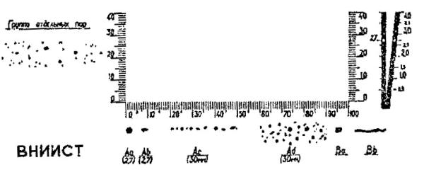 Примечания: 1. К цепочке относятся такие поры и шлаки, которые расположены на одной линии в количестве не менее трех с расстоянием между ними, равным трехкратной величине дефекта или меньшим ее. 2. К скоплению относятся такие поры и шлаки, которые имеют кучное расположение в количестве не менее трех о расстоянием между ними, равным трехкратной величине дефекта или меньшим ее. 3. Величину подрезов и смещений кромок измеряют при внешнем осмотре сварных соединений. Приложение 13Рекомендуемое Примеры записи дефектов при оформлении заключений1. На снимке видны изображения двух продольных трещин, длина которых 10 мм, а глубина 20% толщины основного металла; непровара по кромке длиной 100 мм и глубиной 7%; одного шлакового включения с максимальным размером 5 мм и глубиной 10%; цепочки пор длиной 25 мм с диаметром поры 2 мм и глубиной 5%. При расшифровке этого снимка производят следующую запись: Еа - 10 - 2 - 20%; Дс - 100 - 7%; Ва - 5 - 1 - 10%; Ac - 25 - 2 - 1 - 5%. 2. На снимке видны изображения десяти одиночных сферических пор диаметром (глубиной) около 1 мм. При расшифровке этого снимка производят следующую запись: Аа - 1 - 10 < 10%. Памятка контролера-дефектоскописта по использованию вспомогательного приспособления «Дефектоскопическая линейка» при оценке качества сварных соединений магистральных трубопроводов 1. Дефектоскопическая линейка является вспомогательным инструментом для расшифровки радиографических снимков сварных стыков трубопроводов и определения недопустимых размеров обнаруженных дефектов в плане в соответствии с требованиями СНиП III-42-80, ВСН 2-146-82, ВСН 2-120-80, ВОН 2-124-60 и других нормативных документов. 2. Дефектоскопическая линейка выполнена в виде гибкой прозрачной лавсановой пластины размером 70×200 мм с нанесенными на ней миллиметровыми шкалами для измерения продольных и поперечных размеров дефектов, эталонным измерителем для определения максимального размера отдельного дефекта (поры, шлакового включения и др.). На линейке представлены варианты изображений отдельных пор и шлаковых включений, цепочки пор и скопления пор. Отдельно, в левой верхней части, приведено изображение отдельных пор различного диаметра (данное изображение показывает плотность распределения пор, относящихся в соответствии с нормативными документами к отдельным дефектам). Общий вид линейки представлен на рис.1.