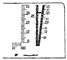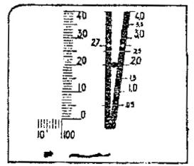 Рис. 1. Общий вид дефектоскопической линейки 3. При расшифровке радиографического снимка последний помещают на просмотровое окно негатоскопа горизонтально и рассматривают через прозрачную часть дефектоскопической линейки, постепенно перемещая ее вдоль изображения сварного шва. Сравнением с эталонным дефектом, изображенным в нижней части дефектоскопической линейки, определяют вид дефекта на снимке (поры, шлаковые включения, скопление пор, цепочка пор) и по измерительной шкале линейки оценивают допустимость размеров этого дефекта, а также расстояние между отдельными дефектами. Путем сравнения с примером изображения пор в левой части линейки определяют группу отдельных пор (в отличие от скопления пор), т.е. такую группу, расстояние между тремя любыми порами в которой превышает трехкратный диаметр (длину) наибольшей из них. Диаметр и длину отдельного дефекта определяют с помощью измерителя, помещенного в правой части дефектоскопической линейки. При этом линейку накладывают на снимок таким образом, чтобы дефект оказался в клинообразном окне измерителя, а края дефекта касались границ окна, как показано на рис. 2 и 3. Против точек касания считывают (приближенно определяют) размер дефекта. Так, на рис. 2 диаметр дефекта равен 2,0 мм, на рис. 3 длина дефекта равна 3,2 мм. Ошибка в определении размера отдельного дефекта с помощью данного измерителя не превышает 0,1-0,2 мм.