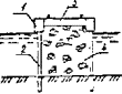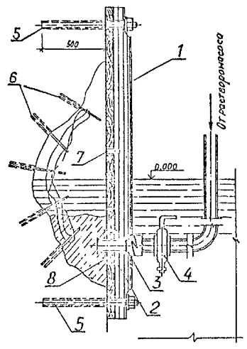 где i - интенсивность бетонирования, м3/м2 . ч; R - необходимый радиус действия трубы (труб), требуемый для перекрытия заданной площади бетонирования, м; t - заглубление трубы в бетонную смесь, м. Величина заглубления низа трубы в укладываемую бетонную смесь определяется из выражения: t = 2KiM Минимальное заглубление трубы в течение всего времени бетонирования без вибрации должно быть не менее 0,8 м для глубины до 10, 1,2 - для глубины более 10 и 1,5 м - для глубины более 20 м. Минимальное заглубление трубы при укладке бетона с вибрацией должно быть для вышеуказанных глубин соответственно 0,5; 0,75 и 1 м. Верх бетона в трубе должен возвышаться над уровнем воды не менее чем на величину h, определяемую по формуле h = R - 0,6Н м, где Н - высота воды над ремонтируемой конструкцией, м. Верх подводного бетона следует доводить до отметки, превышающей проектную на величину, равную 2 % от высоты конструкции, но не менее 200 мм, после достижения бетоном прочности 2,5 МПа удаляется верхний слабый слой бетона. 4.4.60. Порядок бетонирования методом ВР аналогичен методу ВПТ. Для обеспечения свободного подъема труб их устанавливают в ограждающие металлические каркасные шахты, если конструкция имеет высоту более 1,5 м. 4.4.61. Первоначальное заполнение труб раствором при безнапорном бетонировании следует производить, применяя скользящие пробки для труб диаметром 100 мм (при глубине бетонирования более 5 м) и для труб диаметром 75 мм (при глубине бетонирования более 10 м); при других диаметрах и глубинах бетонирования заполнение труб раствором допускается производить без пробок, предварительно заполняя трубы (шланги) цементным раствором (без песка). 4.4.62. Заглубление труб в укладываемый раствор при бетонировании любым из методов ВР должно быть не менее 0,8 м, заглубление вибраторов при вибронагнетательном методе - не менее 0,5 м. Скорость бетонирования для безнапорного и вибронагнетательного методов должна быть не менее 0,4 м/ч, а для напорного бетонирования 3 - 6 м/ч. 4.4.63. Радиус действия труб должен устанавливаться по результатам бетонирования опытных образцов. При составлении проекта производства работ и определении режимов бетонирования радиус действия труб следует рассчитывать по формулам: для безнапорного бетонирования по форме r = 0,5hзR; (4.5) для напорного бетонирования (инъекционным методом) r = 1,5hк(Hв + 2hв); (4.6) для вибронагнетательного бетонирования - r = hз(lк - 5) . 10-2; (4.7) где R - величина, обратная уклону распространения раствора в крупном заполнителе, принимаемая в предварительных подсчетах равной 5; hв - превышение столба раствора над уровнем воды в блоке, м (или приведенное к превышению столба раствора избыточное давление растворонасоса на выходе из трубы); lк - подвижность раствора, измеряемая осадкой стандартного конуса, см; hз - коэффициент заполнителя, принимаемый для щебня, при безнапорном бетонировании, равным 0,7 и вибронагнетательном бетонировании, равным 16,5, а для гравия при безнапорном бетонировании, равным 1 и вибронагнетательном бетонировании, равным 18; hк - коэффициент крупности заполнителя, численное значение которого принимается равным средней крупности зерен заполнителя, м. 4.4.64. Превышение столба раствора в трубе над уровнем раствора в бетонируемой конструкции определяются формулой: hв = 1,5 + 0,45 Hв, (4.8) где Hв - высота столба воды над уровнем раствора в блоке, м. 4.4.65. Организация