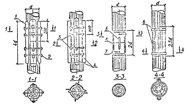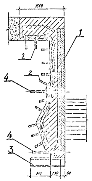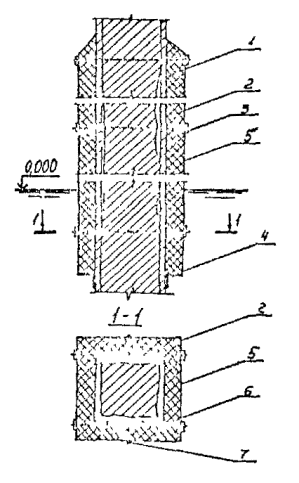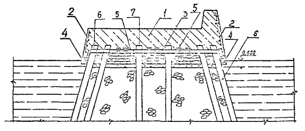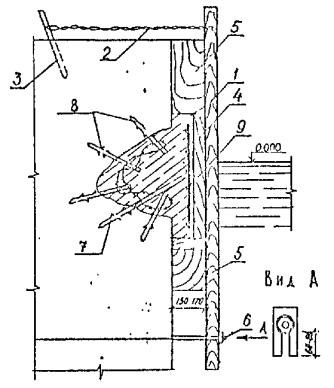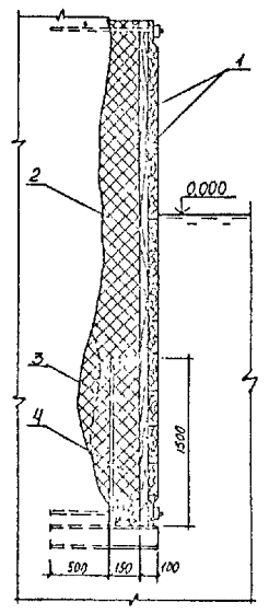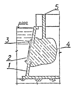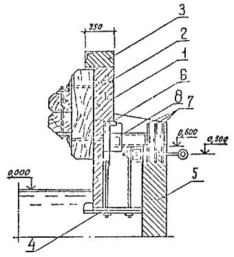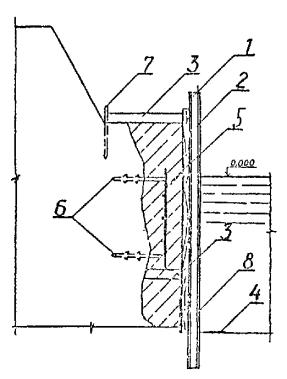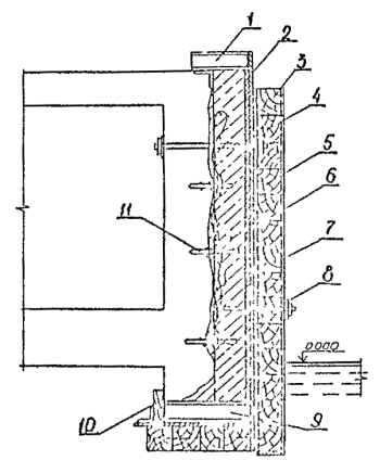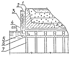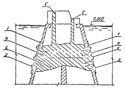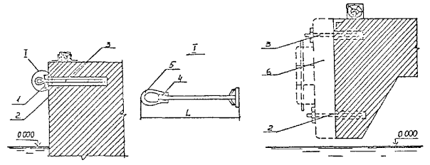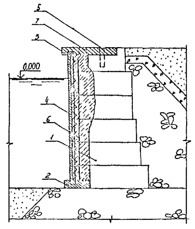 5.1.15. Перед подъемом сборных элементов конструкции необходимо выполнить подготовительные работы по очистке их от снега, наледи, грязи и др., проверить размеры элементов и наличие на них всех необходимых монтажных рисок и других пометок. Не разрешается удалять с поверхности элементов наледь с помощью горячей воды, пара, раствора соли. 5.2. Бетонные и железобетонные сооружения и их элементы в зоне переменного уровня и под водой.5.2.1. Ремонт различных типов бетонных и железобетонных сооружений и их элементов в зоне переменного уровня и под водой показан на схемах (см. справочное приложение 16). 5.2.2. Восстановление поврежденных бетонных и железобетонных сооружений и их элементов в зоне переменного уровня надлежит осуществлять следующими способами ремонта: устройством монтажного армированного бетонного пояса при наличии значительных по глубине повреждений и большой протяженности их вдоль фронта сооружений (см. справочное приложение 16, рис. 4). Высота армированного бетонного пояса должна быть больше высоты зоны переменного уровня и должна назначаться проектом. Длина пояса должна быть равна длине ремонтируемой грани сооружения или его отдельного участка. Толщина армированного бетонного пояса должна задаваться проектом в пределах до 30 см в зависимости от способа бетонирования и применяемого для этой цели оборудования, а также с обязательным соблюдением условия, при котором пояс не должен выступать за пределы выноса отбойной рамы причального сооружения, а в случаях наличия отбойного устройства из резиновых элементов - за пределы выноса этих элементов в сжатом состоянии; бетонированием отдельных мест разрушений в виде каверн, пробоин, глубоких трещин при небольшом их количестве на сооружении и с объемом каждой из них не менее 0,5 м3 (см. справочное приложение 16, рис. 5); устройством теплоизоляционного защитного пояса или экрана из битумно-шлаковой смеси (приложение 43 по рекомендации "Временных указаний по ремонту морских гидротехнических сооружений в зоне переменного уровня") при наличии на всей поверхности сооружения, эксплуатируемого в тяжелых условиях, незначительных по глубине разрушений (до 15 см). Устройство теплоизоляционного пояса под водой на кратковременно обнаженных участках сооружения рекомендуется выполнять путем установки готовых плит из битумно-шлаковой смеси. Крепление защитного пояса к сооружению следует производить с помощью анкерных болтов. Толщина теплоизоляционного пояса из битумно-шлаковой смеси для тяжелых условий службы должна приниматься в пределах от 8 до 20 см при контактной защите и от 15 до 40 см при защите, выполняемой в виде экрана. 5.2.3. При ремонте сооружений, работающих в тяжелых условиях, рекомендуется применять несъемную опалубку с теплоизоляционным слоем (см. справочное приложение 16, рис. 6). 5.2.4. Способы применения опалубочных щитов должны выбираться в зависимости от конструктивных особенностей сооружения, условий ремонта и типа применяемой опалубки. Верхние анкерные болты крепления опалубки рекомендуется закладывать так, чтобы они могли быть использованы для крепления рамы. 5.2.5. Связь сборных плит-опалубок с монолитным бетоном должна обеспечиваться за счет устройства на внутренней поверхности плит-опалубок «шубы» (путем снятия цементной пленки и оголения крупного заполнителя) и змеев